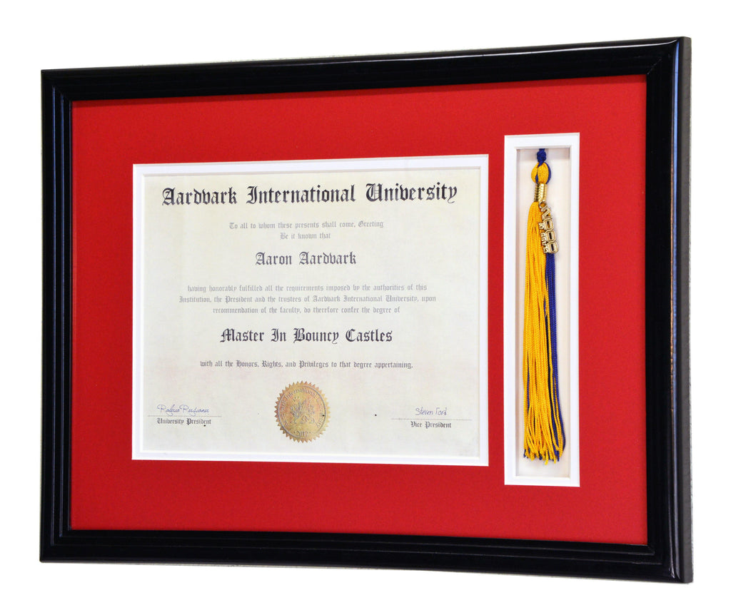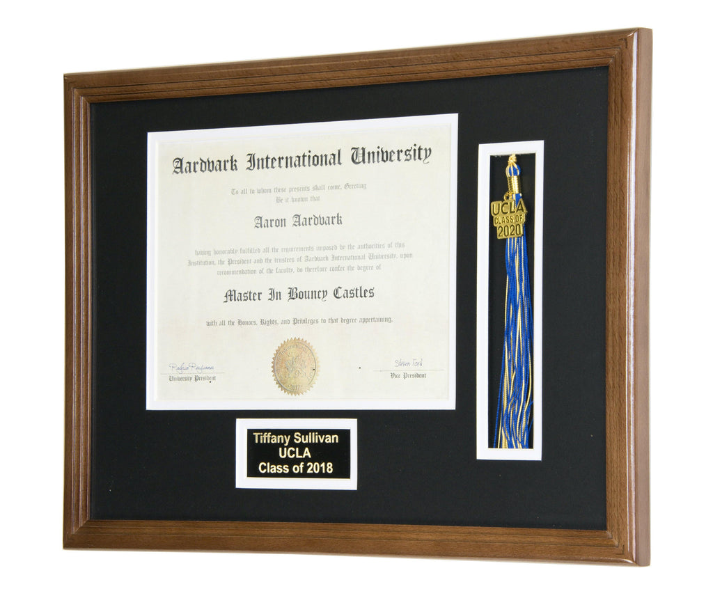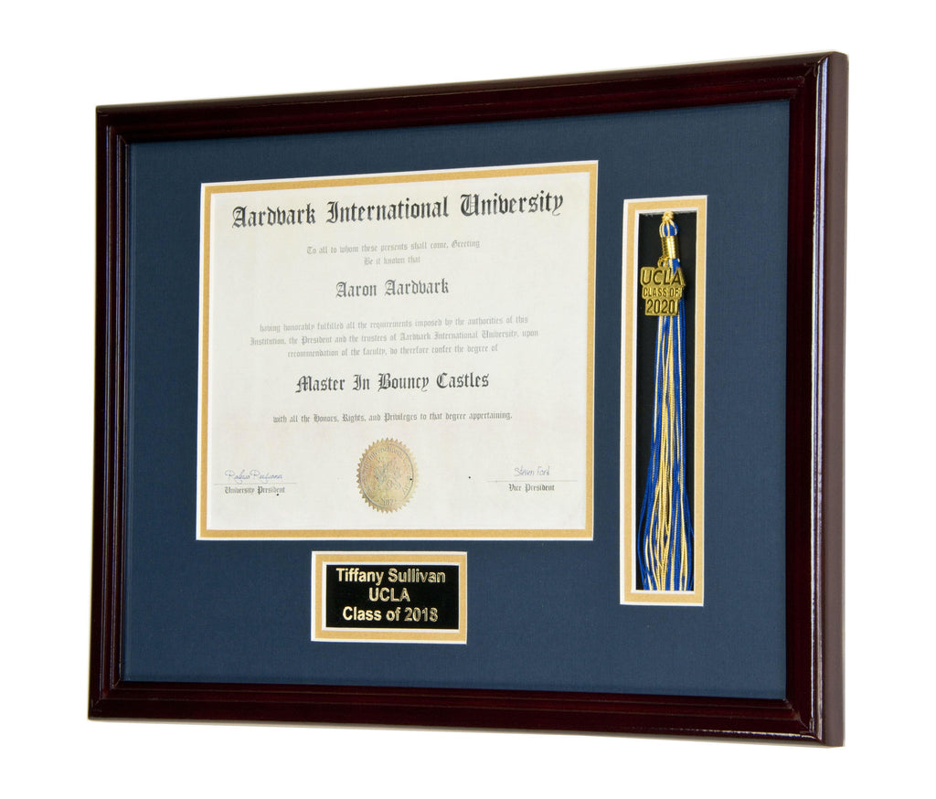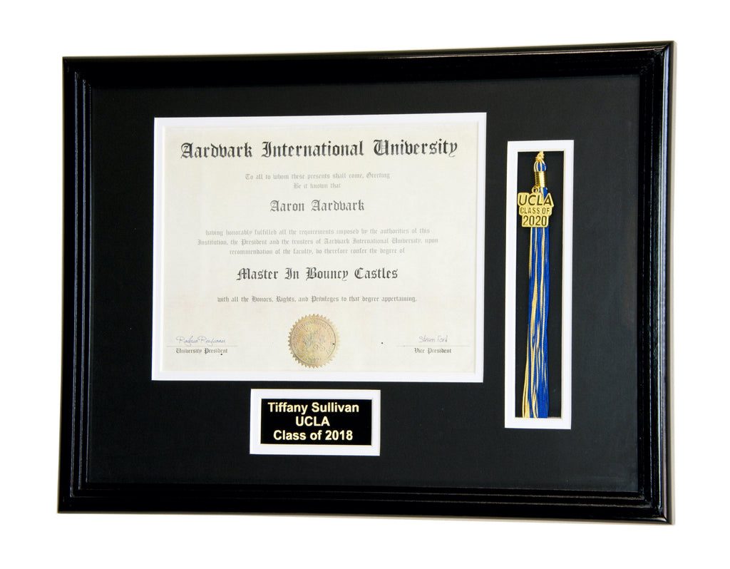This diploma display frame includes a choice of matting layouts that shows 1 diploma and tassle, diploma with engraving, or diploma with both tassle and engraving. Choose a custom matting color to match the school colors. Perfect for any high school, college, or university graduate to elegantly display their diploma, certificate, or award.