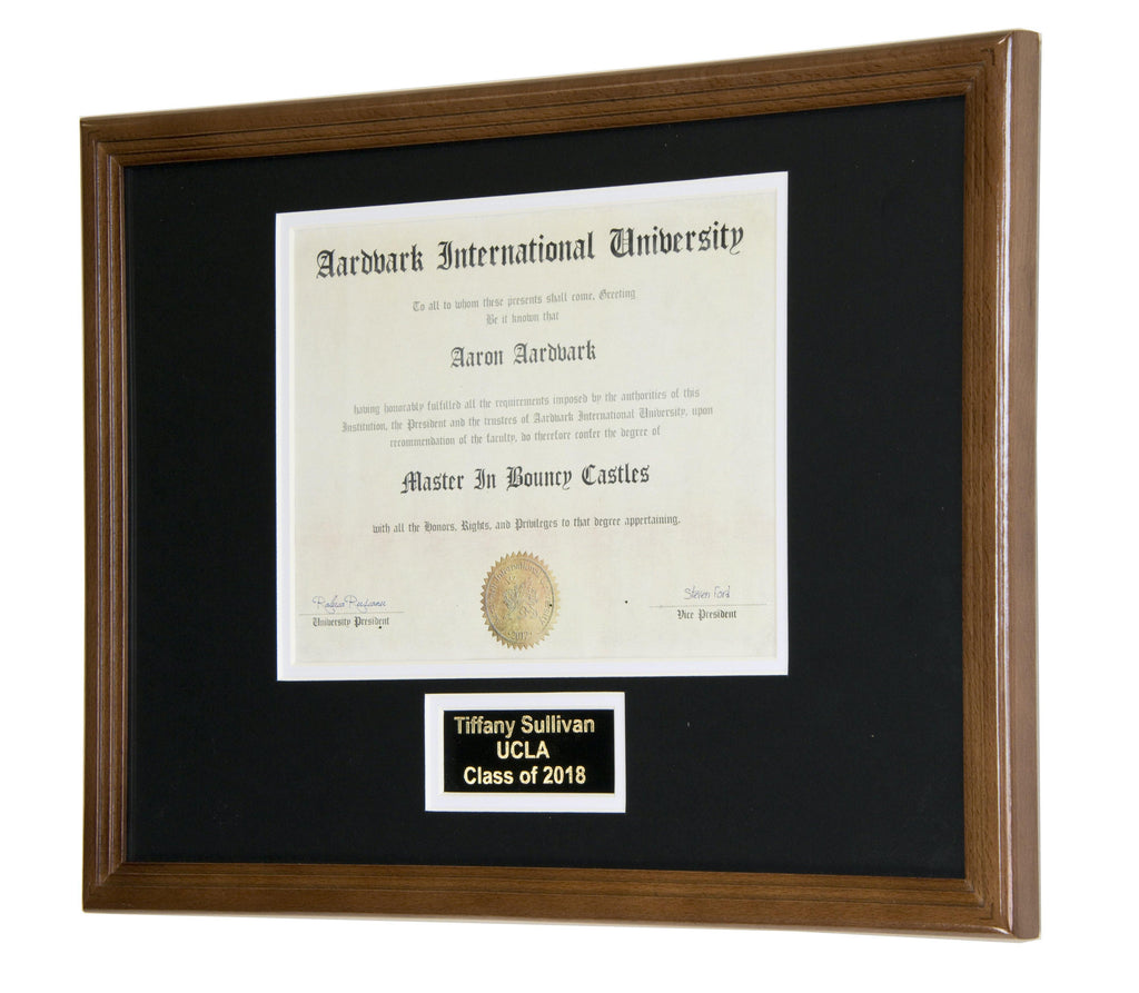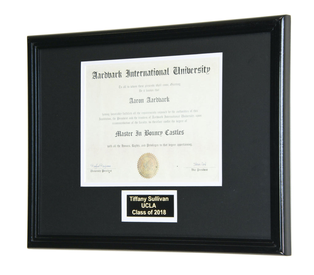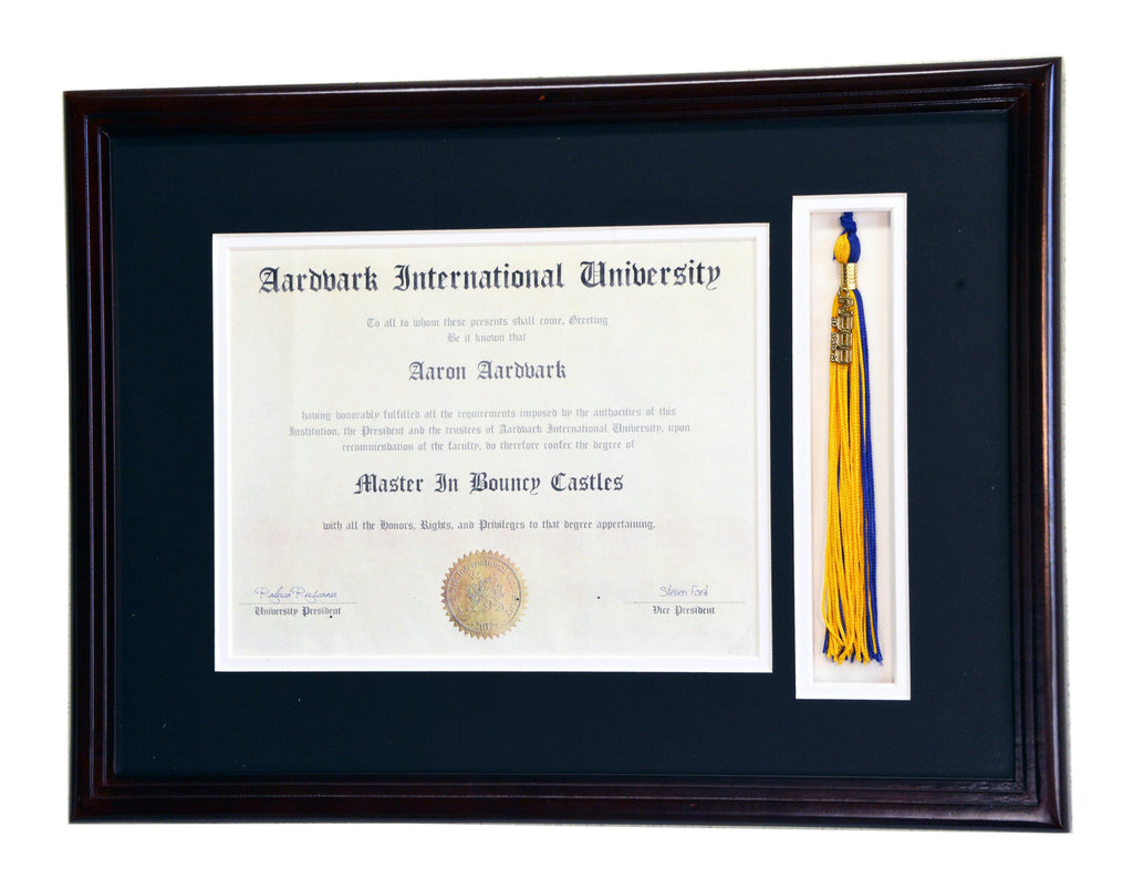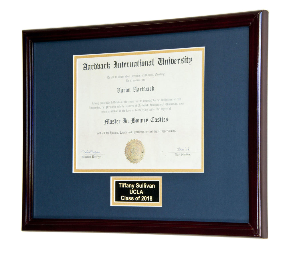 This diploma display frame includes a choice of matting layouts that shows 1 diploma and tassle, diploma with engraving, or diploma with both tassle and engraving. Choose a custom matting color to match the school colors. Perfect for any high school, college, or university graduate to elegantly display their diploma, certificate, or award.