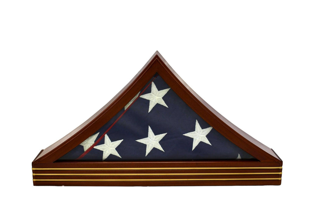 This flag display case features a curved triangular shape and three decorative metallic-colored inlay stripes. Good for showcasing a folded military, service, burial, or heirloom flag up to 5x9.5 feet. It has a glass front and back picture frame opening. Case comes fully assembled. Ideal for displaying on a shelf or table. Not intended for hanging on a wall.