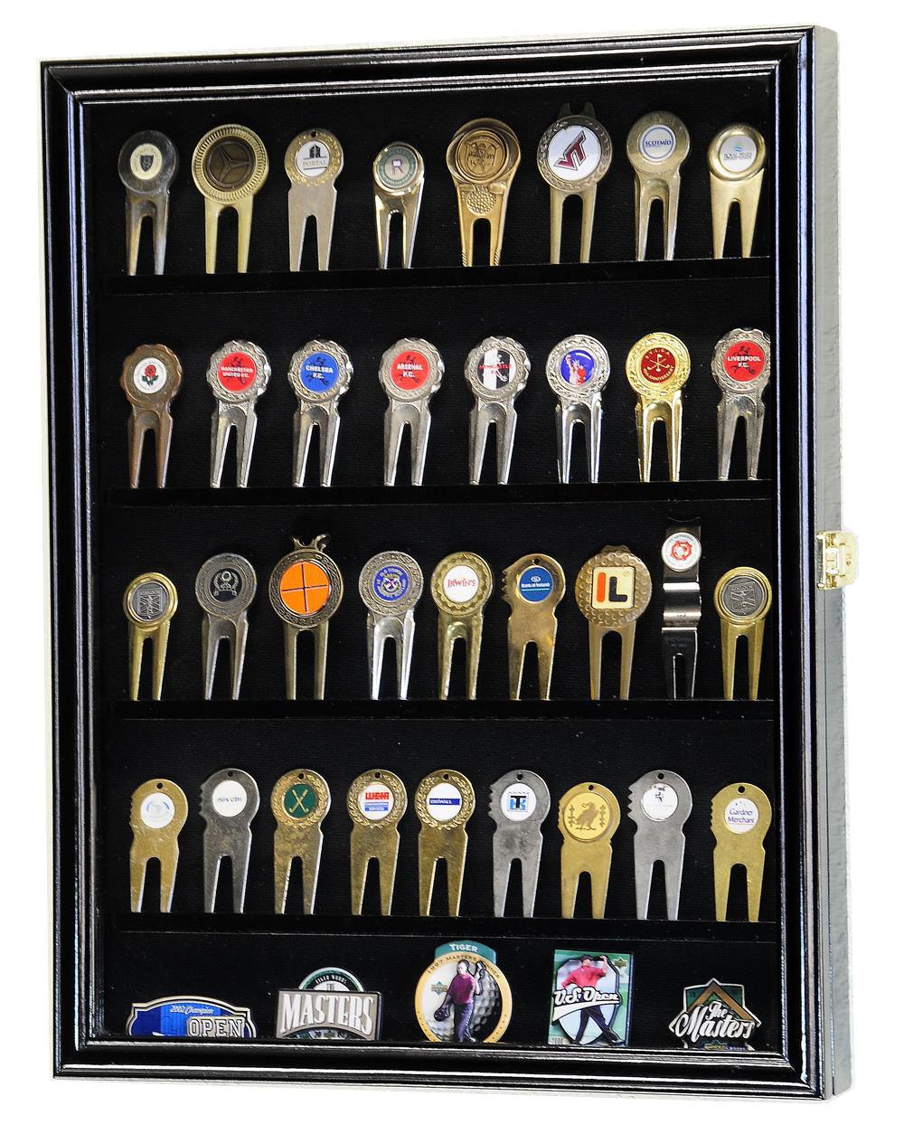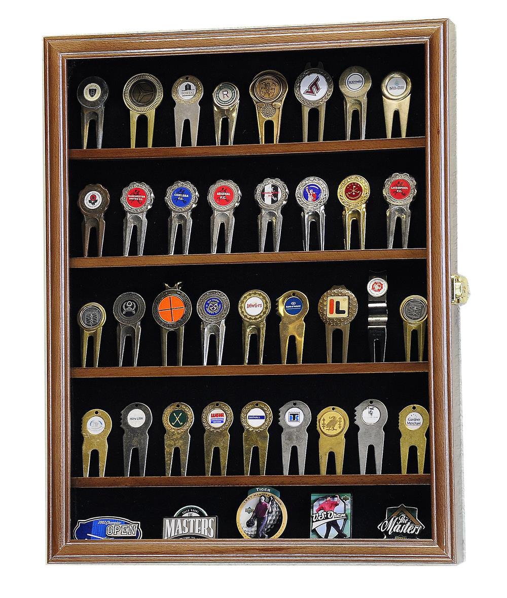Display it in this beautiful Golf Divot Coin Display Case Cabinet, designed with a UV-protection acrylic door, grooved shelves, and a pinnable felt background to securely showcase a mix of golf divot tools and coins.