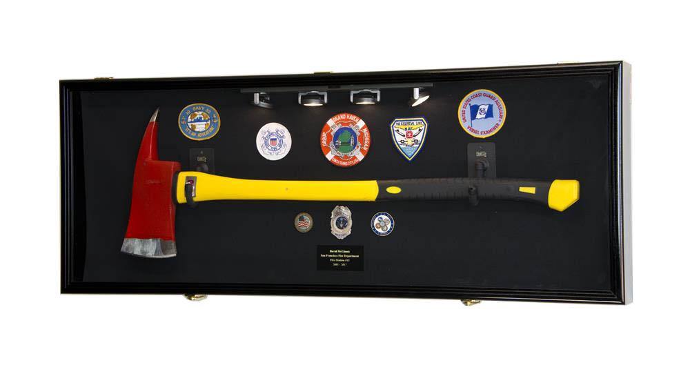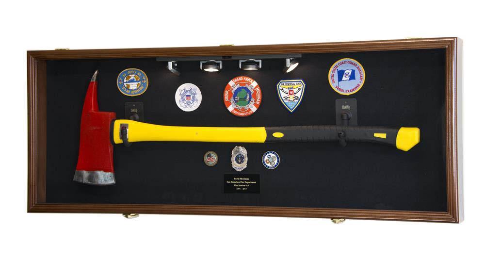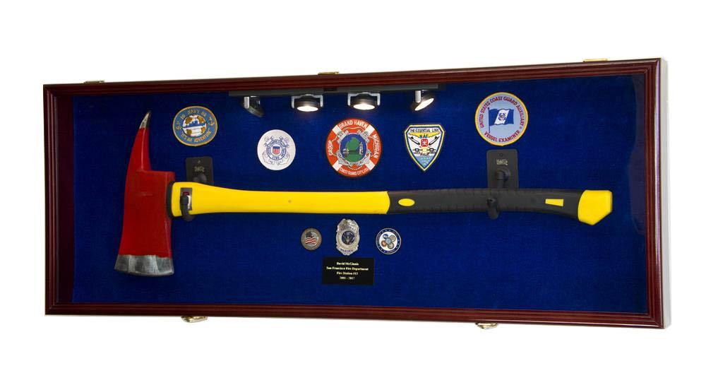 Show them your appreciation with this beautiful Fireman Axe Display Case Cabinet, designed to securely showcase 1 fireman axe with badges, pins, and accessories on a striking felt background. Level up your display with optional LED add-on lights.