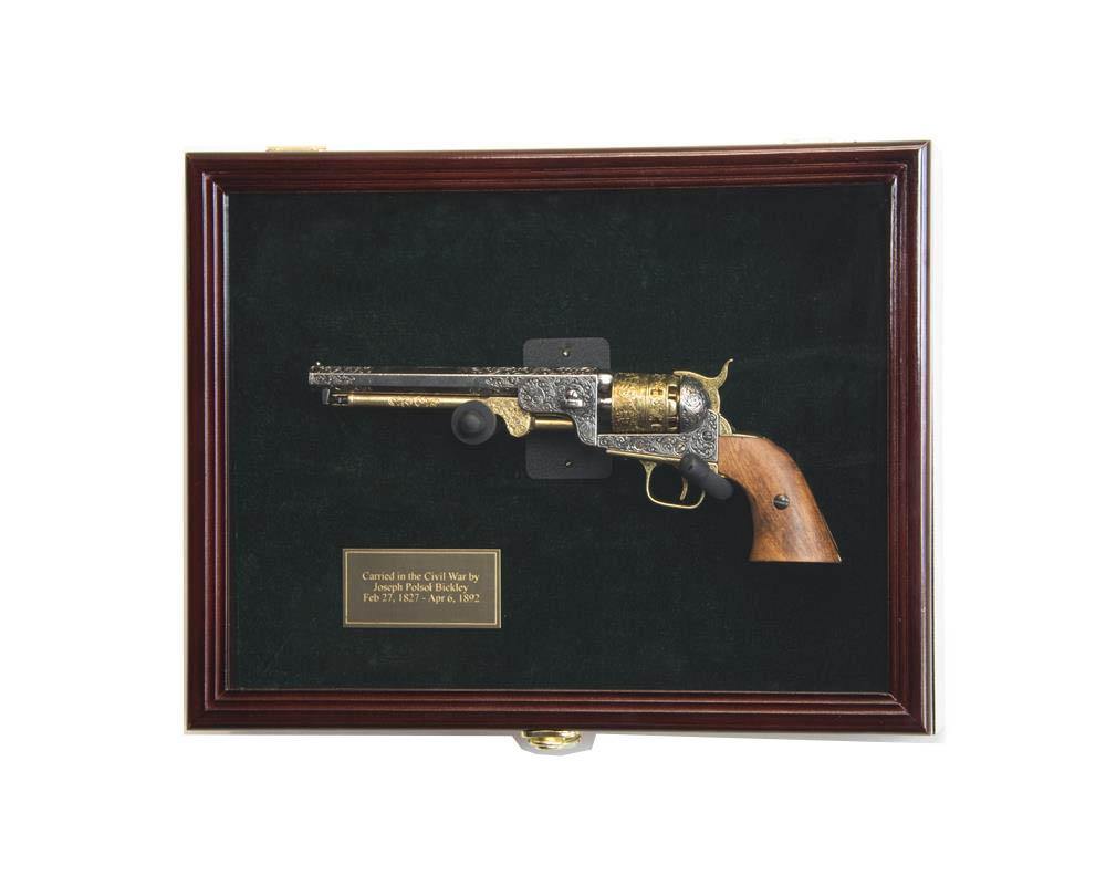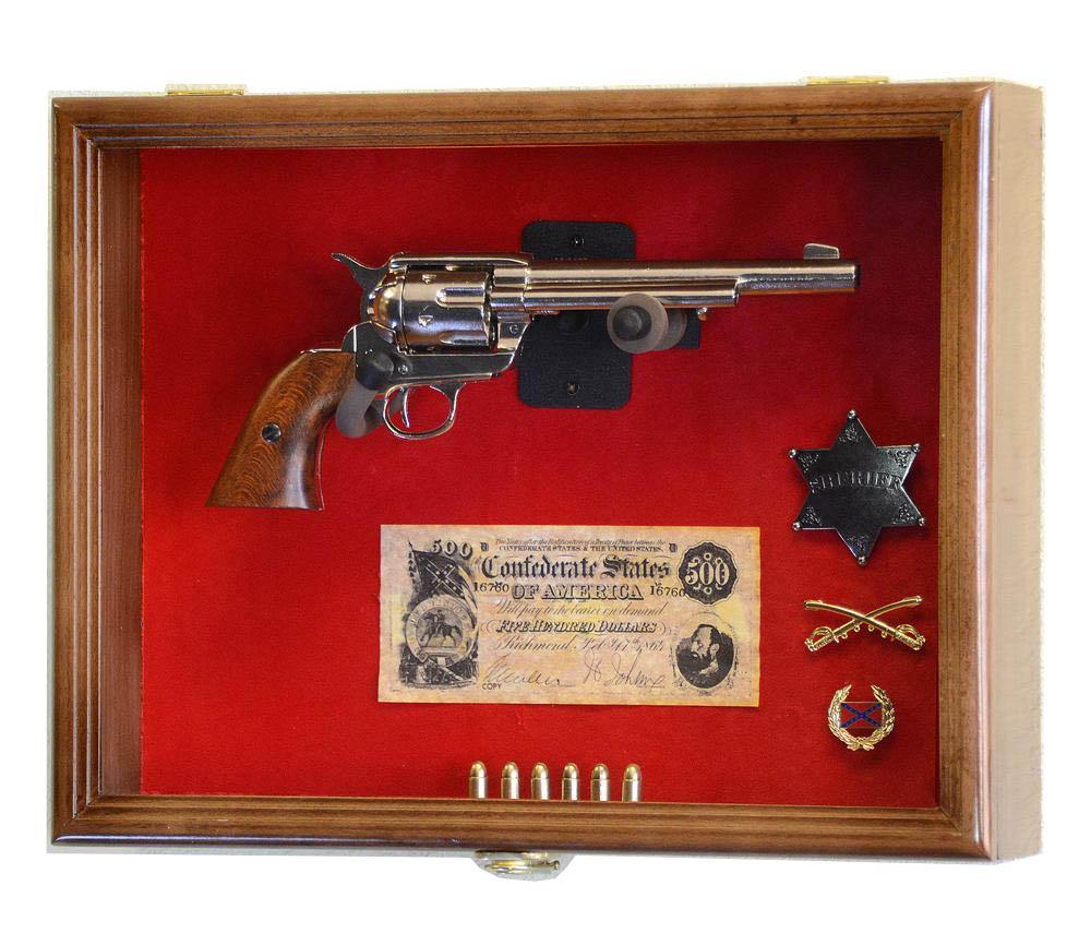 This gun display case accommodates 1 large pistol or up to 2 pistols. Protected by our ultra-clear, specially-coated, UV-protection acrylic. The felt background adds a visual contrast for your rifles. 1 gun mounting kit (composed of 2 sturdy padded metal hooks) is included in your package and installed at your discretion to create the best fit**. Case comes fully assembled. Mounting hardware is shipped in the same package.